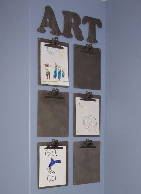 Rather than adding endlessly to your gallery, specify a number of pieces that can be displayed at one time, and let your child decide which ones to replace when they come home with new artwork they are proud of. A simple way to do this is to install a wire clothesline or a set of clipboards organized into a grid on your gallery wall – each clip (or pair of clips) can be dedicated to a single piece of art and once the clips are full, your young artist can decide which pieces they are ready to replace with new art.