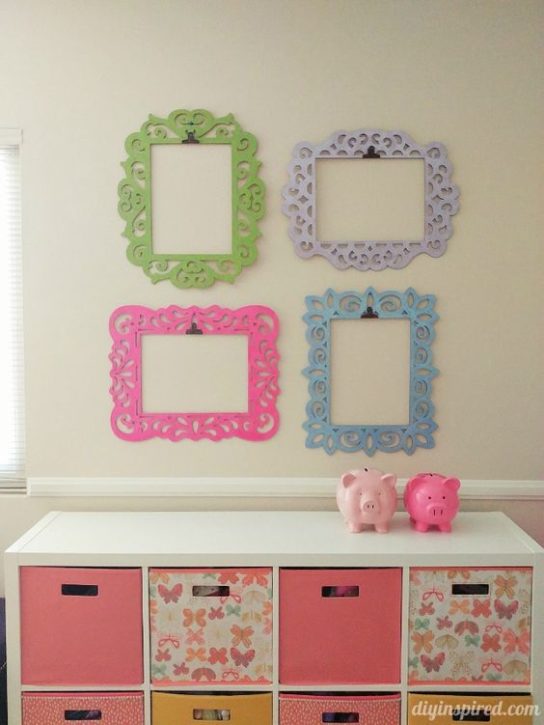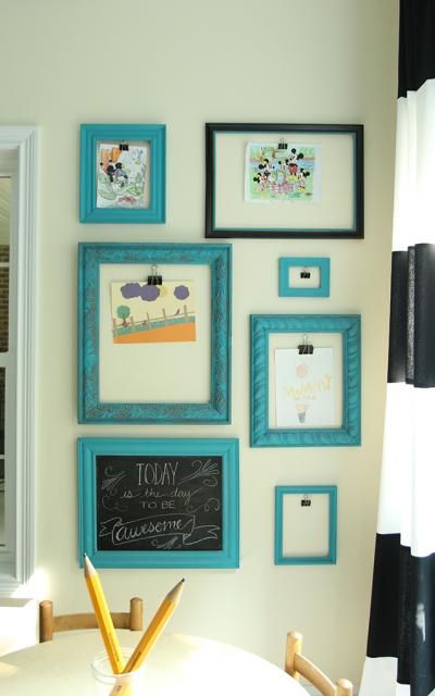 Whether you choose to use traditional frames, adhesive frames, or clips, think of it like cards – try to keep your hand to either all the same colour or all the same suit…but you don’t have to have both! Purchase a wide variety of sizes and styles of frames and spray paint them all the same colour, or alternatively, purchase multiple of the same frame and paint them a variety of fun colours, to reflect the creativity in the artwork they will house. Either way, the result will be a gallery that has structure and style, but is still fun and diverse enough to play host to any work of art your kid comes up with.