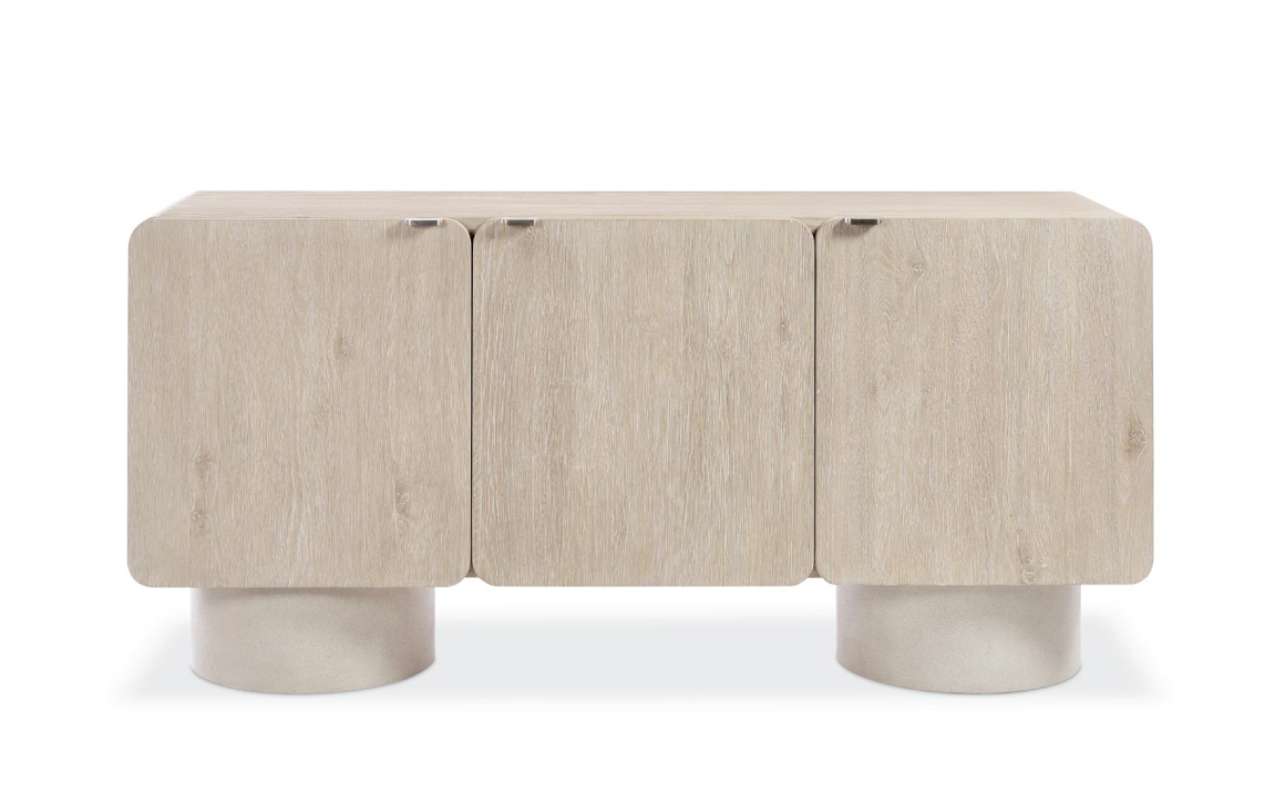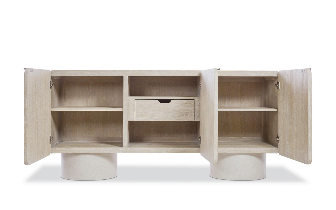 The Antibes Modern Buffet Table blends rustic charm with sleek, organic style. Featuring a bold design, its two round pedestals are crafted from textured glass-reinforced concrete in a Pumice finish, creating a stunning foundation. The wooden case, finished in a light Roz tone, houses three pull-to-open doors adorned with cast aluminum tab pulls in a Graphite finish.