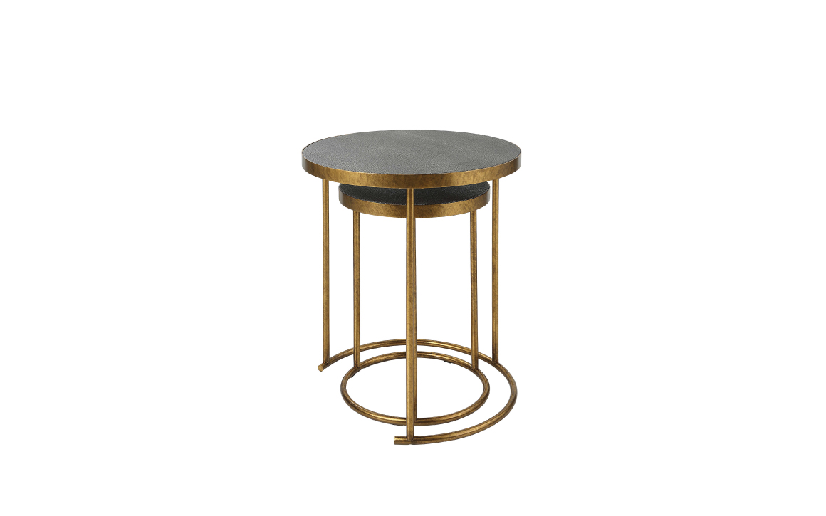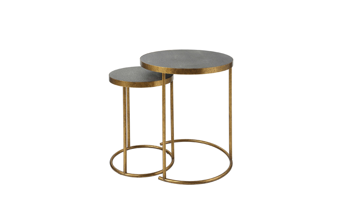 - Materials & Colours: Faux Gray Shagreen wrapped tops, Iron frame with antique burnished brass finish.