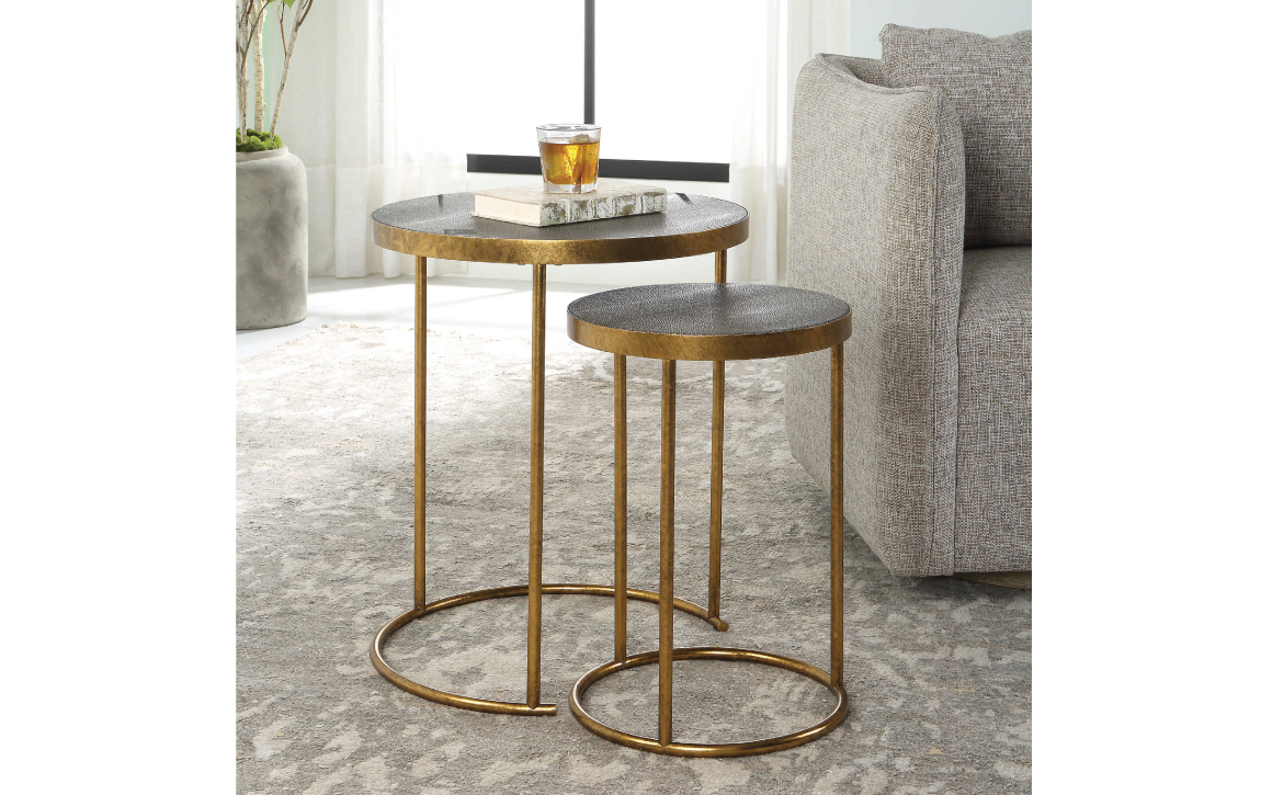 Add sophistication and function to your living space with the Aragon Nesting Coffee Tables, available in Canada. This elegant set of two gray nesting tables offers both style and versatility, perfect for modern and traditional homes alike. Crafted with a sleek iron base and durable wood tops in a neutral gray finish, these tables can be used together for a layered look or separated to maximize space. Designed to fit seamlessly in any room, this nesting coffee table set brings high-quality design and functionality to Canadian homes.