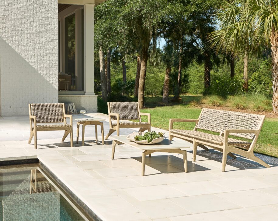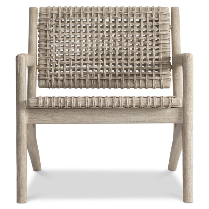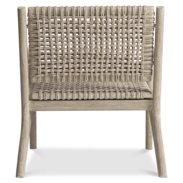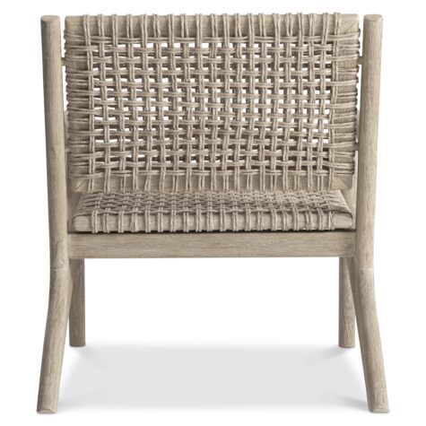 A distinctive open all-weather wicker weave in Pampas finish elevates the style of the laid-back Atlas accent chair. The teak frame in Sea Oat finish has sleek and shapely lines that flow from the straight front legs to the sled-shaped back legs. The mix of materials crafts a uniquely elegant style for outdoor living. Optional purchase fabric pad also available.
