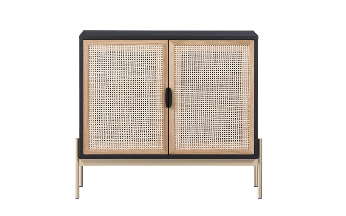 Create a space influenced by global travels with this stylish sideboard crafted in Indonesia. Features two natural rattan cabinets contrasted with a black oak wood frame. Gold iron feet and matte black steel handles complete the design. Large sideboard also available. Handle With Care: This design has been crafted with natural rattan.
