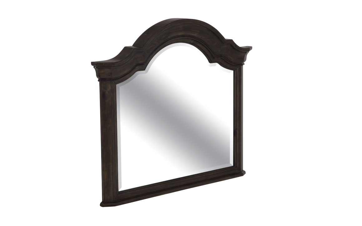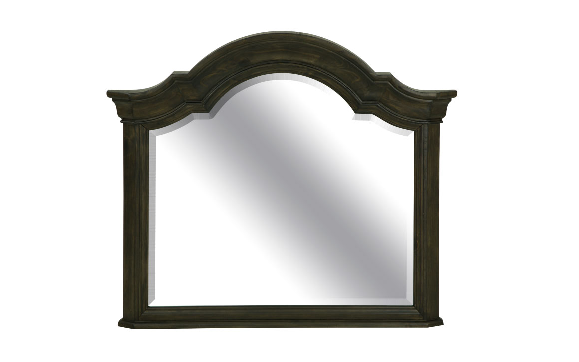 The Bellamy Shaped Mirror is warm and inviting like an old French friend. Bellamy welcomes with European inspired styling in a unique Peppercorn finish and matte black pewter accented hardware. Scrolling open woodwork adorns the well appointed media chest doors while roomy dressers and chests feature rounded corners atop rounded bun feet. A plethora of bed options offer upholstered tufted headboards, storage footboards, panel headboards and gorgeous shaped panels with or without sumptuous scrolled design work for a Chateau feel for any taste.