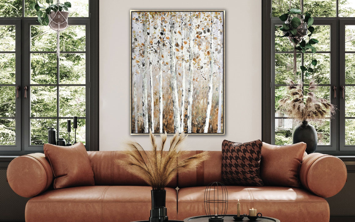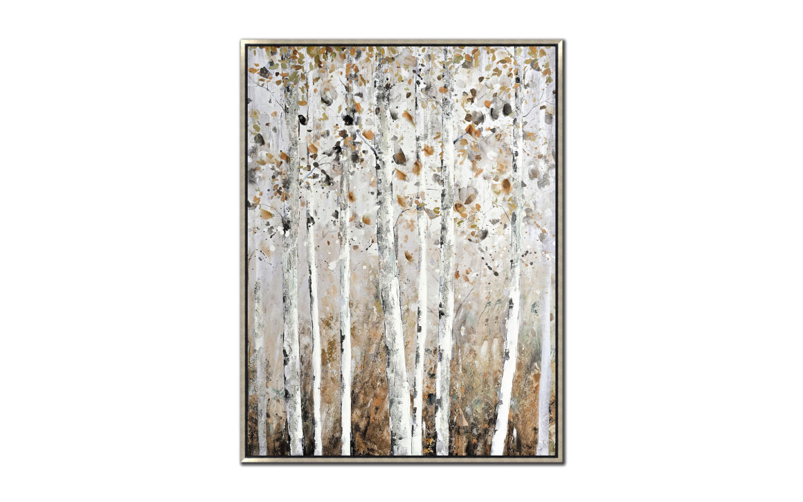 Encased in a champagne floating frame, this masterpiece is not just art—it’s a statement. The frame adds a touch of contemporary flair while ensuring the artwork remains the focal point, suspended in elegance. With this birch tree painting, bring the serenity of the forest into your home.