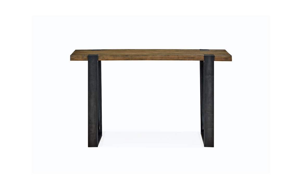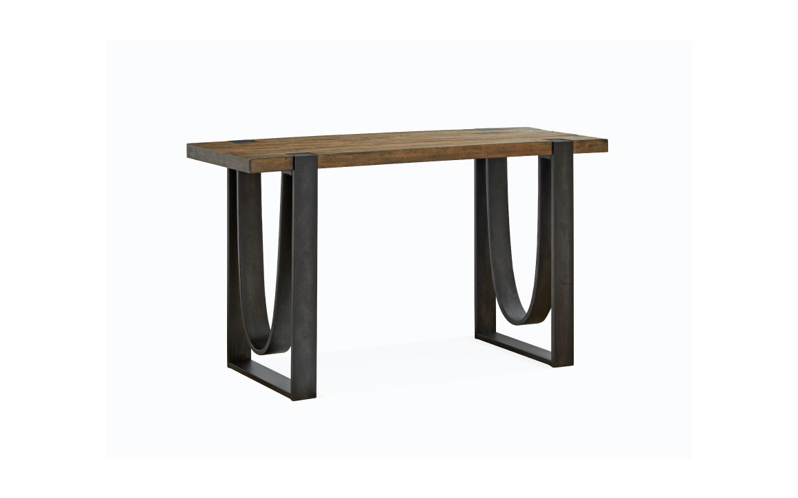 With echoes of equestrian inspired fashion, Bowden extends rustic hospitality with upscale appeal. Distressed iron has been artfully forged into a stirrup like ‘U’ shape and rests inside squared bases to uniquely support aged looking Rustic Honey wood tops on the rectangular end table, cocktail table and sofa table. Mirror image interlocking ‘U’s’ create the exceptionally striking round accent table base to complete a great room with that perfect accessory piece.