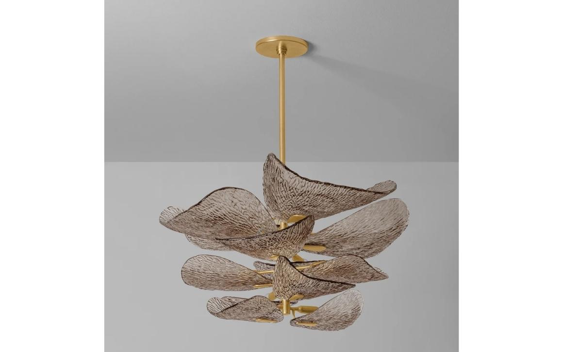 Arranged thoughtfully around a central “stem,” the layered glass creates a floating, organic silhouette that feels both airy and dramatic. A Vintage Gold Leaf accent enhances the chandelier’s luxurious character, balancing the dark glass with a warm metallic glow.