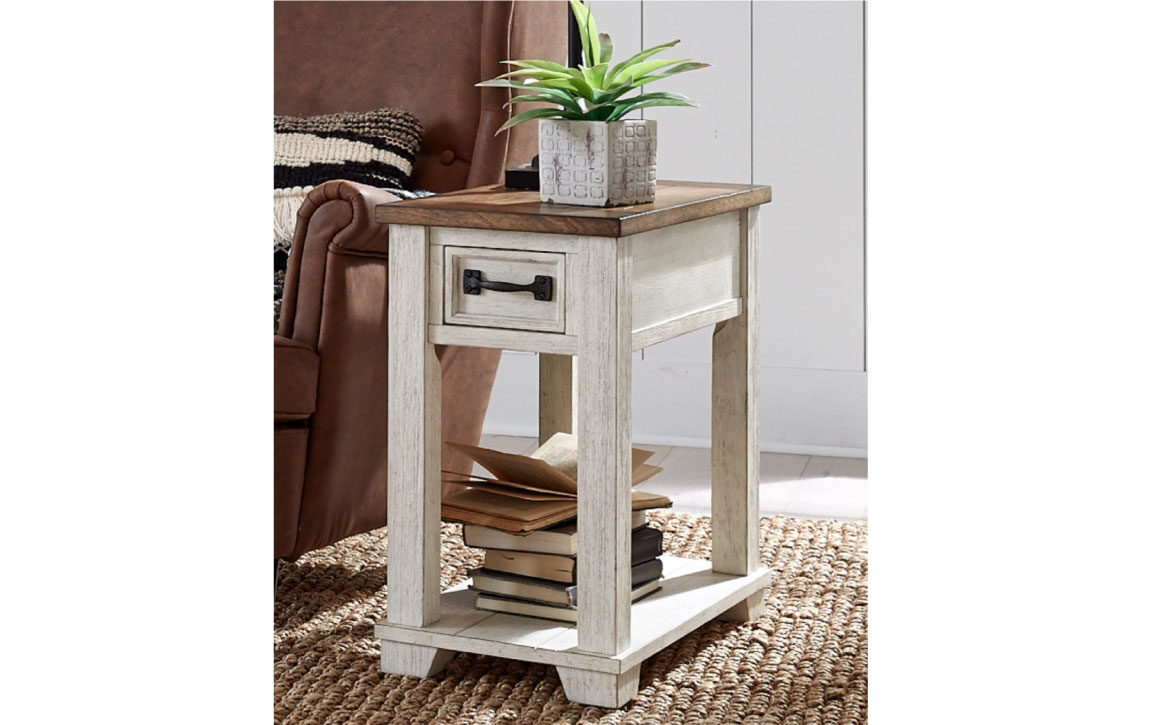 The Chairside End table by Null has a cottage-like style to it, crafted with a two-toned finish and one drawer and one shelf. It is the perfect little table to go on the end of any furniture piece in your living room.