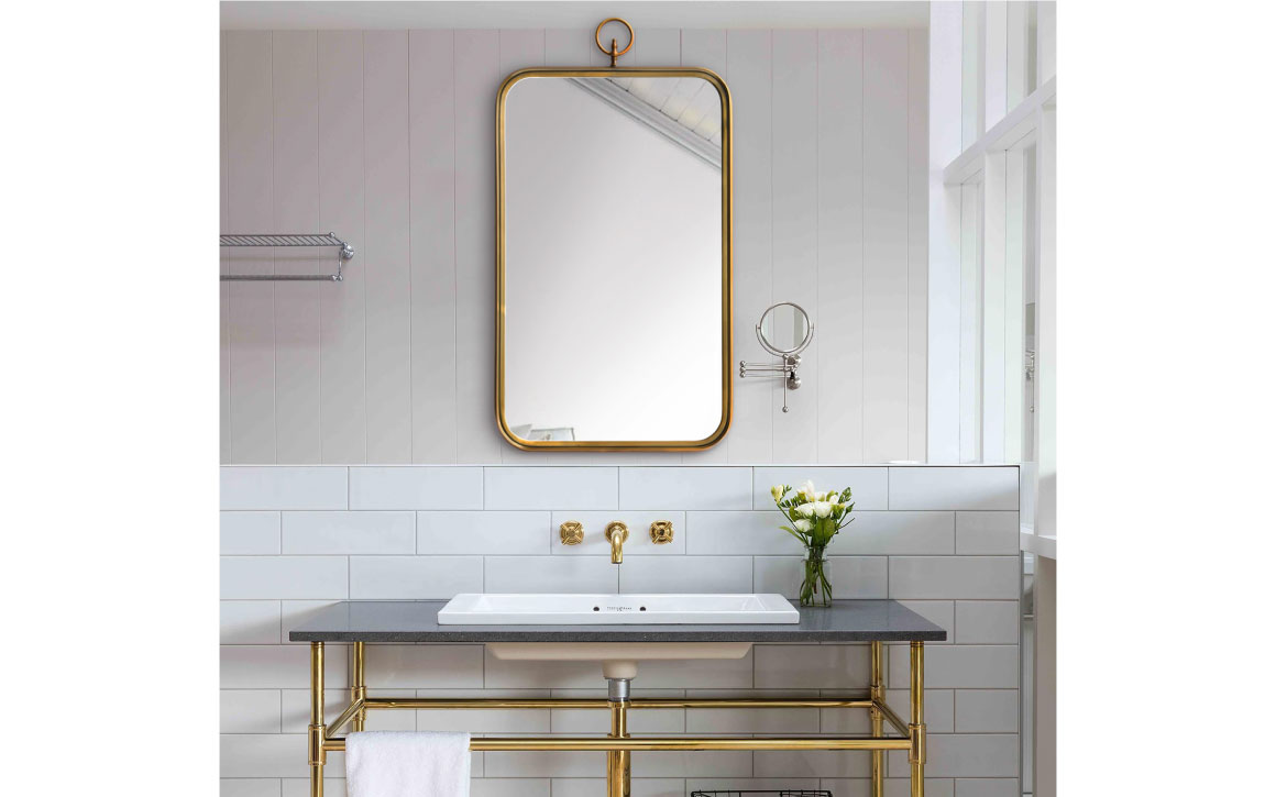 The Coburg hanging wall mirror has a streamlined design with a mid-century flair. The brass finish of the frame complements the large body of the mirror, and makes this mirror a great fit for a contemporary powder room, or even hallway decor.