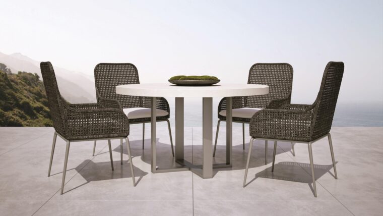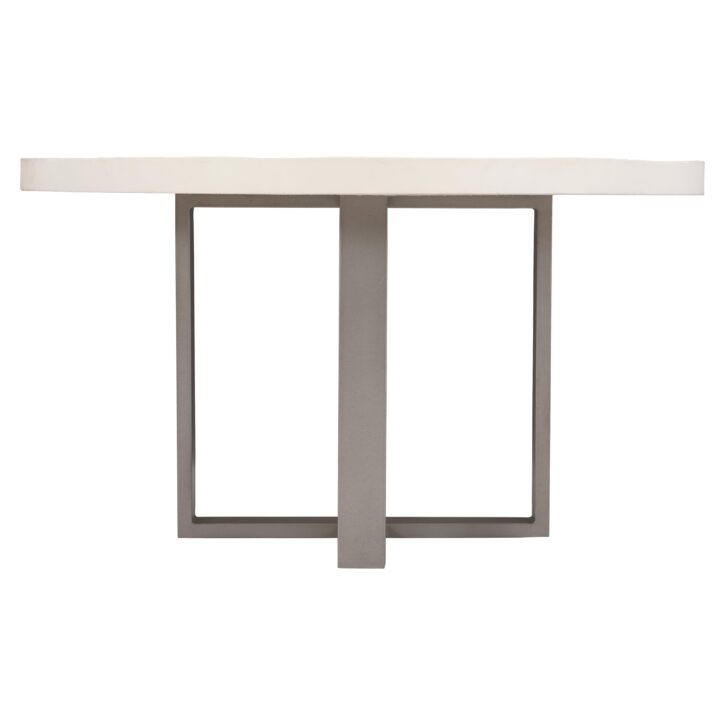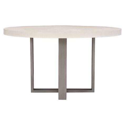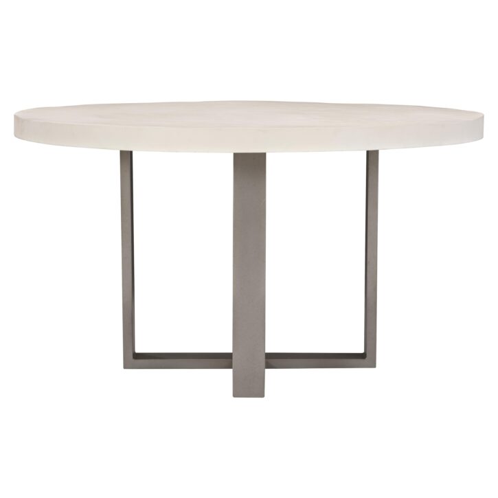 The Del Mar dining table features a round cast concrete top in Bone finish and a stainless steel base finished in flint gray. Clean lines and a neutral palette combine for an enduring modern look that can withstand the elements.