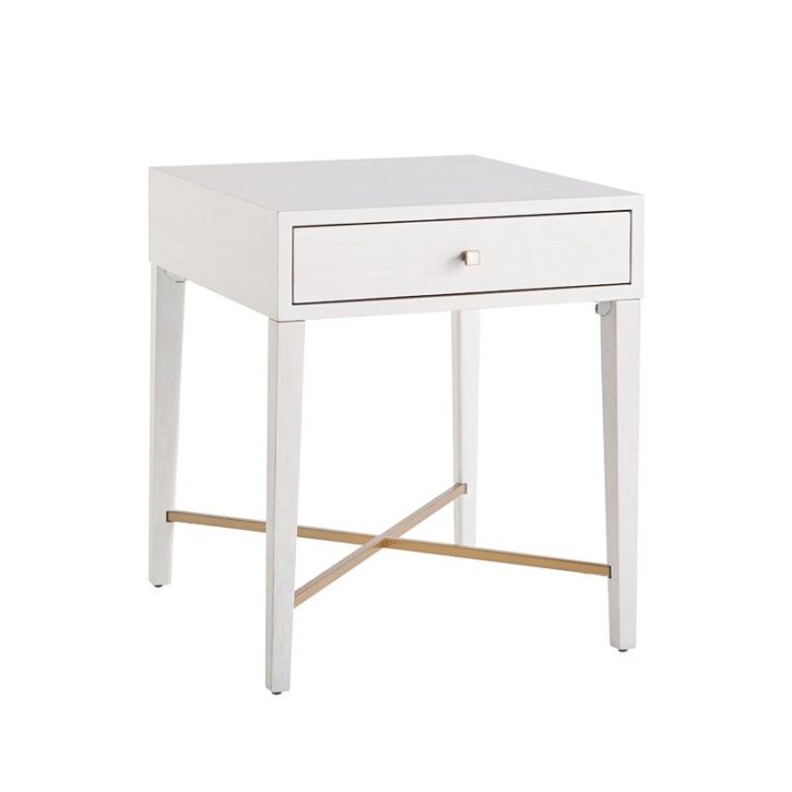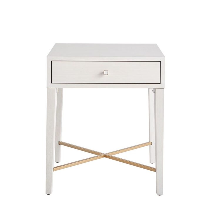 Featuring one drawer with a mother of pearl pull, and a unique X-shaped, soft gold metal accent at the base, this elegant end table is completed with a clean Alabaster finish.