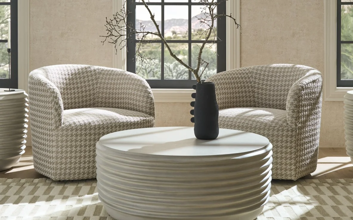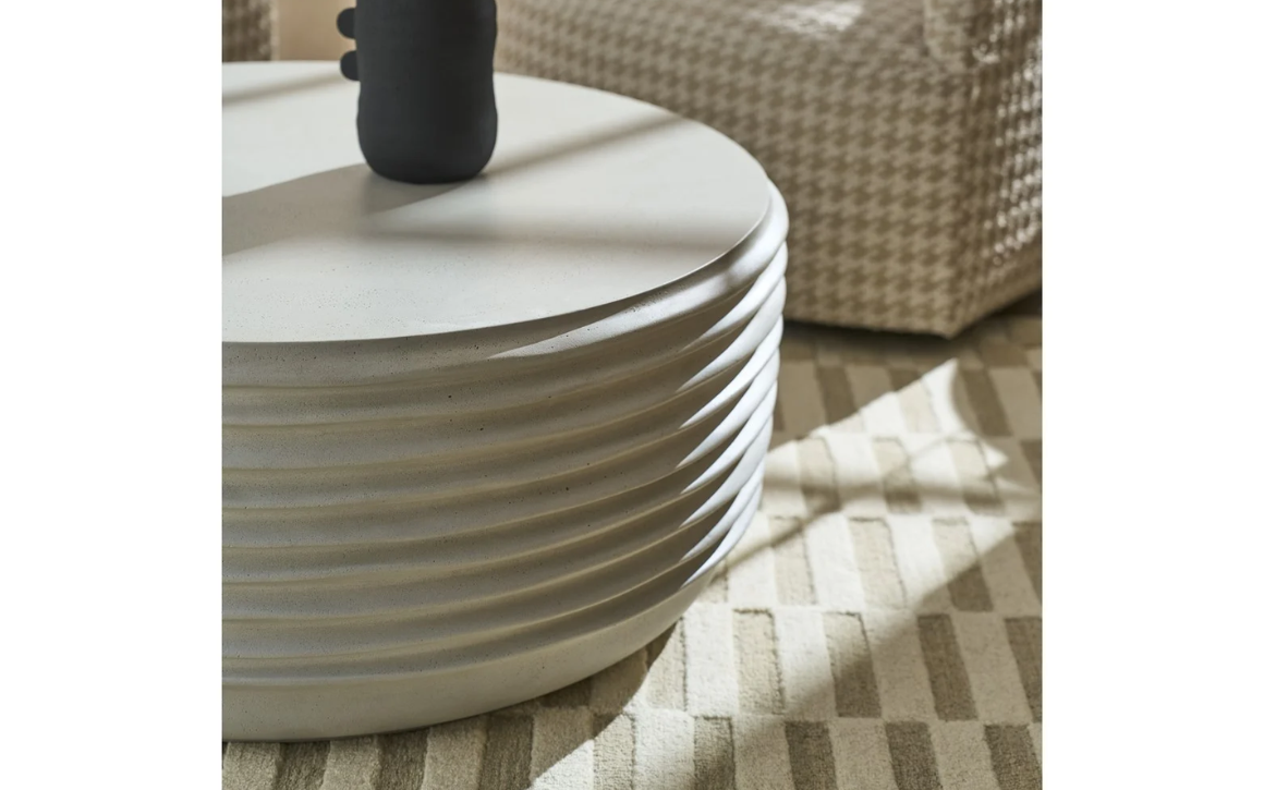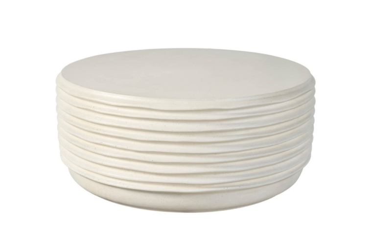 The Dwell Linen Cocktail Table adds a touch of subtle texture and modern elegance to your living space. Its unique, ribbed design and soft linen finish bring a tactile and visually appealing element to your décor. This round cocktail table serves as a stylish centerpiece, offering both a surface for display and a sculptural element to enhance your room’s aesthetic. Its light, neutral tone and distinctive design make it a versatile and sophisticated addition to any contemporary setting.