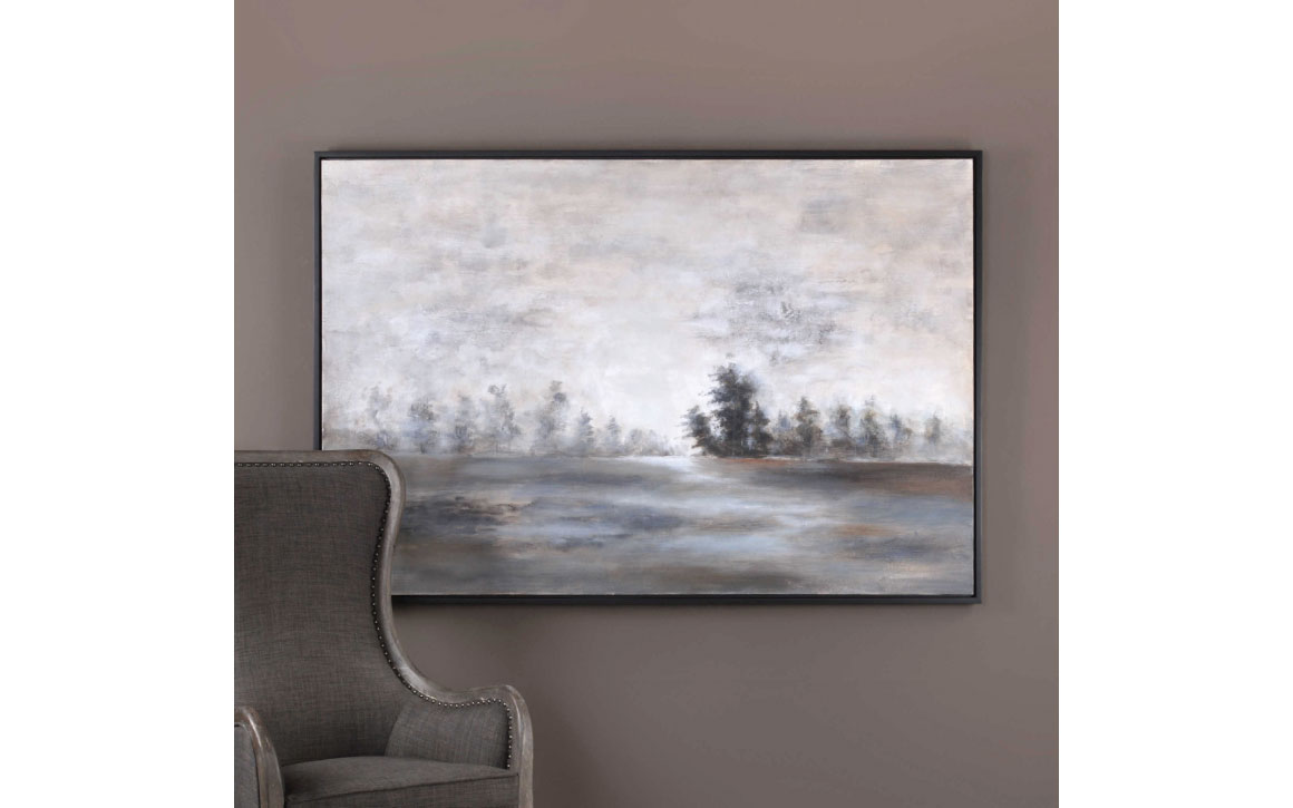 The Evening Mist Hand-Painted Canvas by Uttermost hung on a grey wall.