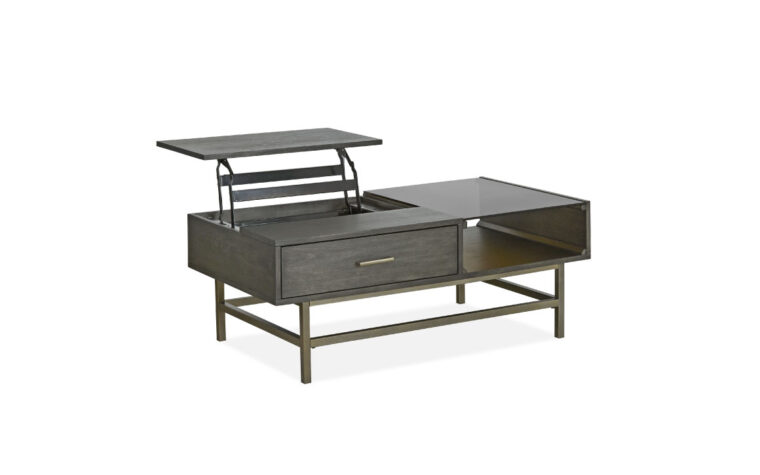 Walnut veneers, Smoke glass and pewter metal combine for retro appeal in Fulton. A decidedly “mod” design aesthetic is created as the wood table cases extend beyond the square tubular, pewter finished metal base frames, appearing to float with finesse. The outstanding Fulton cocktail table features a split top with Smoke glass on the right, revealing an open storage compartment while the left wooden top lifts to accommodate true 1970’s era TV dinners and affords storage beneath.