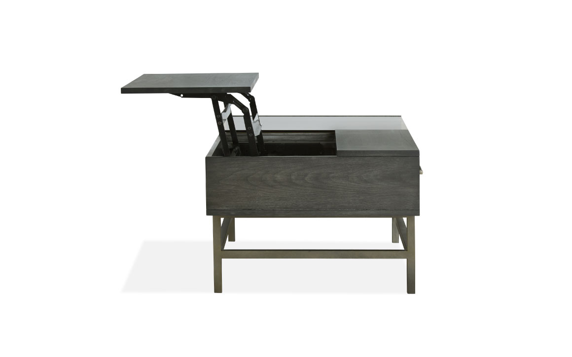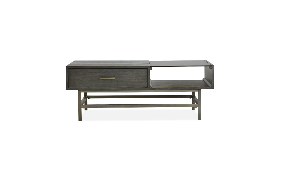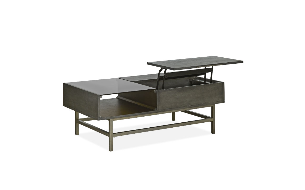 Walnut veneers, Smoke glass and pewter metal combine for retro appeal in Fulton. A decidedly “mod” design aesthetic is created as the wood table cases extend beyond the square tubular, pewter finished metal base frames, appearing to float with finesse. The outstanding Fulton cocktail table features a split top with Smoke glass on the right, revealing an open storage compartment while the left wooden top lifts to accommodate true 1970’s era TV dinners and affords storage beneath.