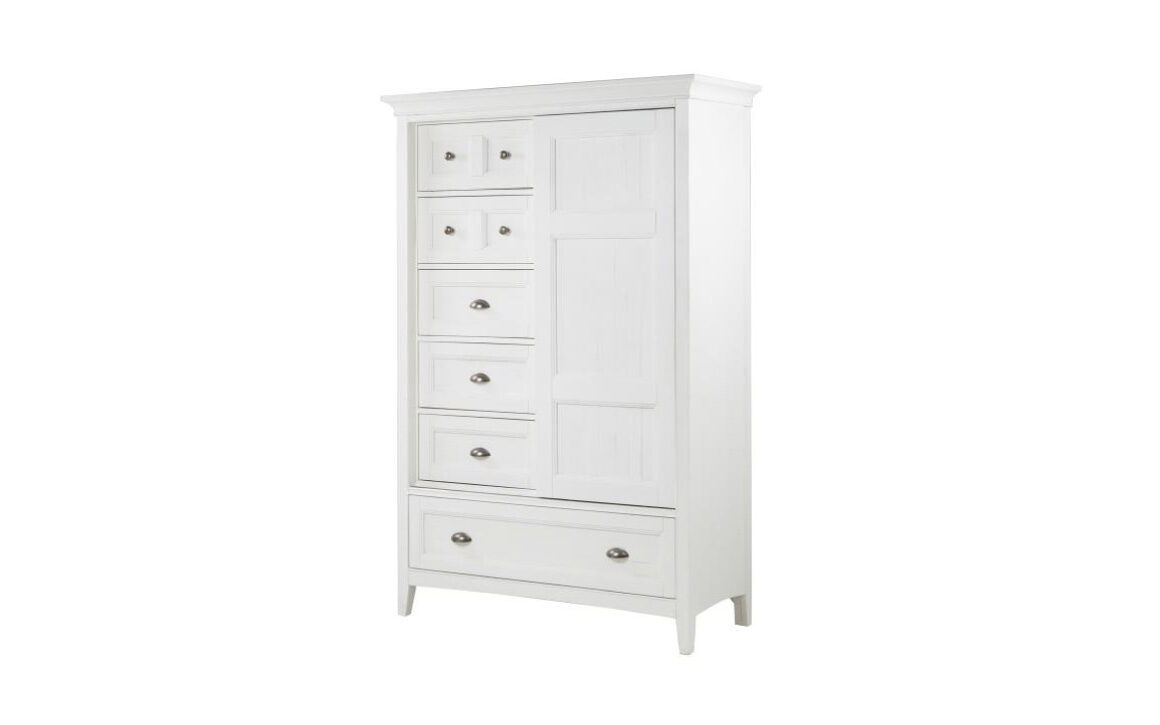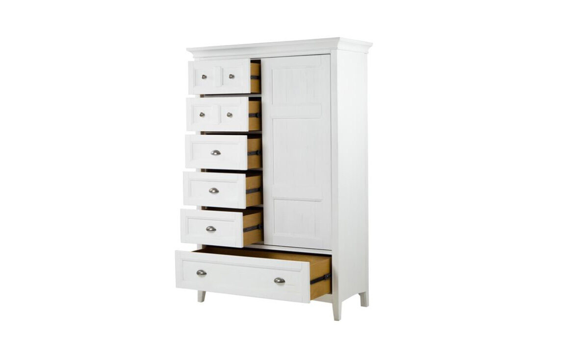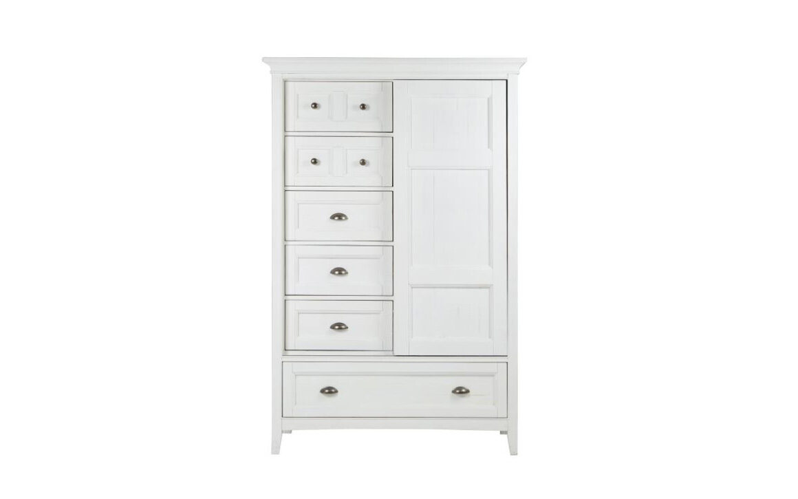 A soft Chalk White finish on Pine veneers and solids creates a relaxed beachy feel in any bedroom with Heron Cove. Straight legs support the straight lined chests with raised beaded trim for cottage appeal. Come home to Heron Cove!