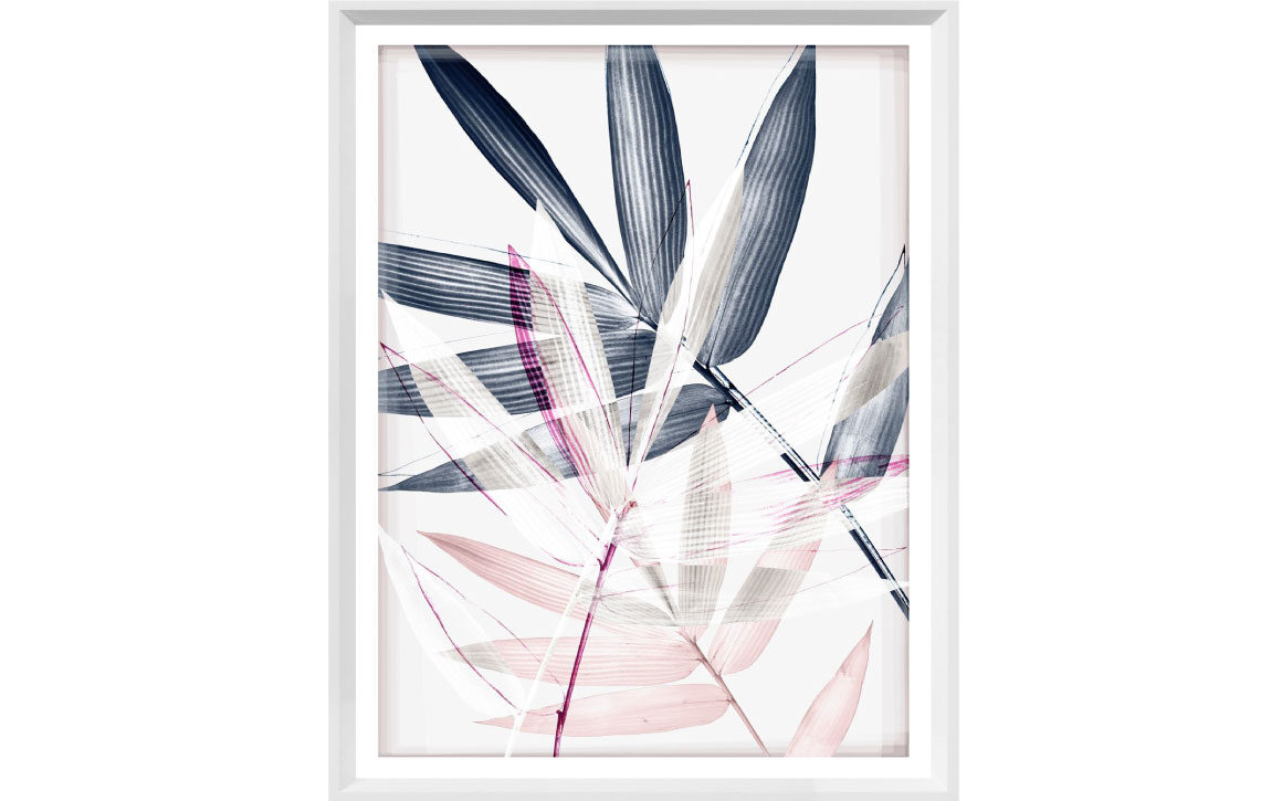 A beautiful piece on modern, floral wall art features an elegant overlay of stylized blush, taupe and deep blue leaves against a fresh white ground make this image contemporary with a traditional undertone.
