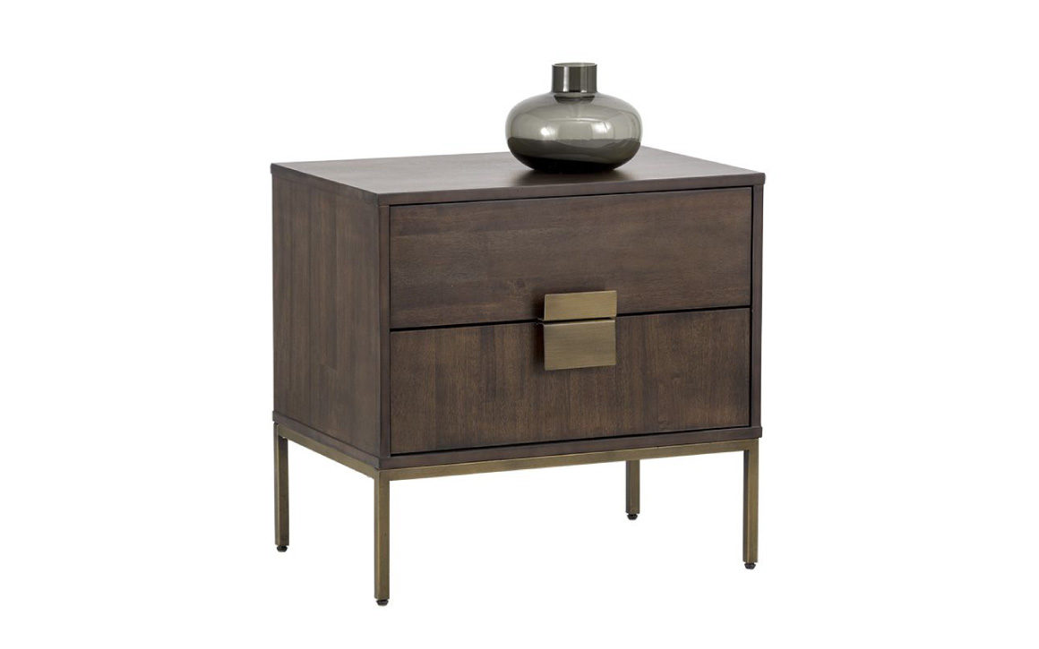 This uniquely crafted Jade Nightstand from our MIXT collection will add transitional allure to any bedroom. Made from acacia wood veneer with two soft closing drawers. Alternating wood grain patterns on the drawer fronts and antique brass hardware complete the look. Suitable for residential and contract settings.