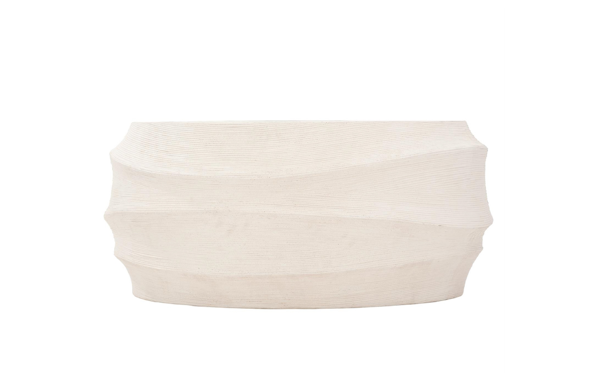 Crafted from natural stonecast, this unique cocktail table features a rattan texture reminiscent of rolling waves. Characterized by exceptional luxury and sophisticated design, Bernhardt Exteriors offers a selection of elegant yet durable accent tables. Crafted from natural stonecast in a white finish, the Kai cocktail table offers shape and movement with a coastal vibe. The rattan texture forms an undulating pattern reminiscent of rolling waves. A protective top coat ensures all-weather performance.