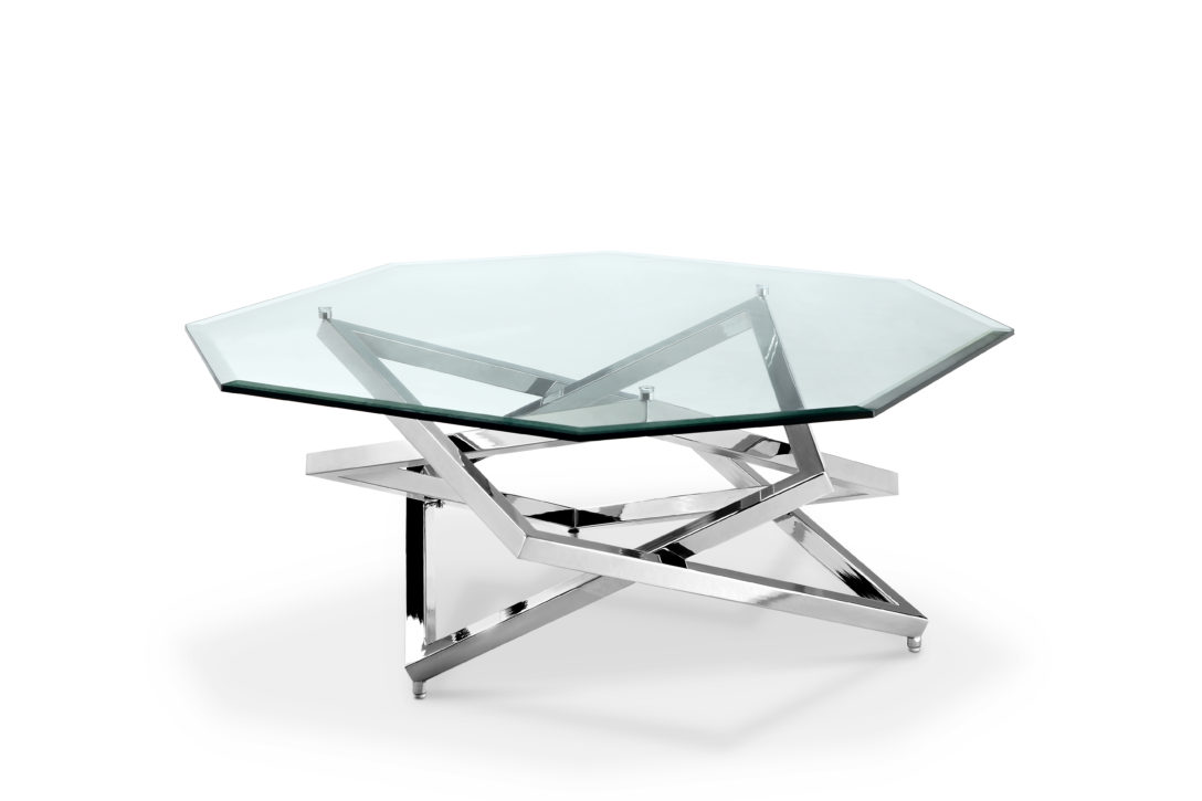 Offset geometric squares are intermingled to create a dramatic play with light for the modern Lenox Square table trio. Polished chrome plated base, topped with 12mm clear tempered glass w/ 1” bevel. Eye-catching and a conversation starter!