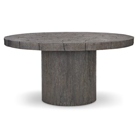 The Madura dining table infuses a space with the fresh energy of organic elements. Crafted from carbonized sliced teak, the round top is composed of uniquely shaped pieces that fit together like a puzzle. The charring process provides impressive durability and a rustic, elegant look, while a smoked truffle finish enhances the natural beauty of the wood.