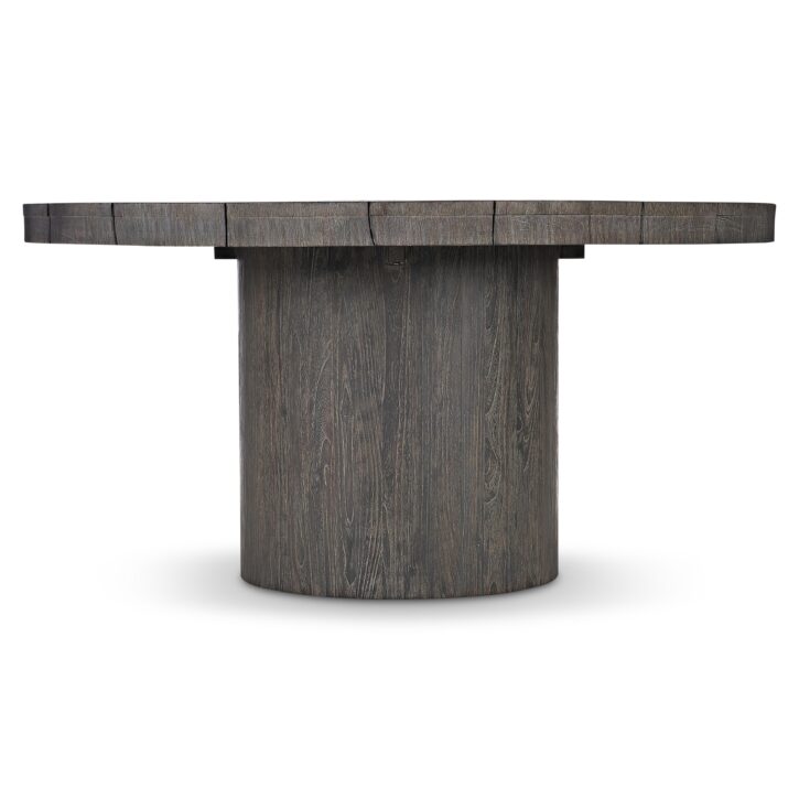 The Madura dining table infuses a space with the fresh energy of organic elements. Crafted from carbonized sliced teak, the round top is composed of uniquely shaped pieces that fit together like a puzzle. The charring process provides impressive durability and a rustic, elegant look, while a smoked truffle finish enhances the natural beauty of the wood.