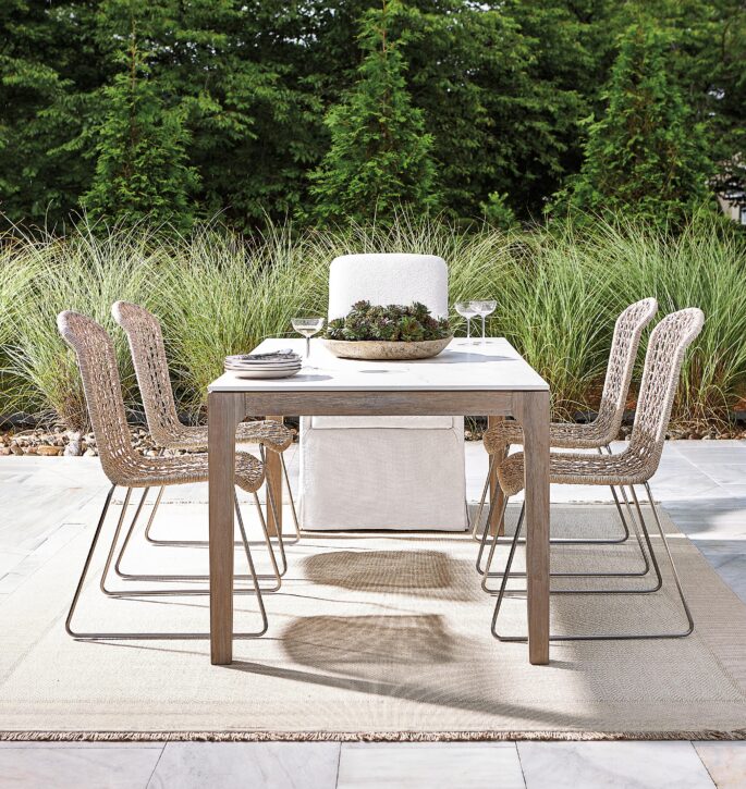 Topped with a Dekton durable stone surface with beautiful veining, the Marbella dining table is equally at home indoors or out. The sleek shape offers quietly beautiful details, like the soft inner curves of the teak frame. The result is a stylish, sophisticated approach to outdoor living.