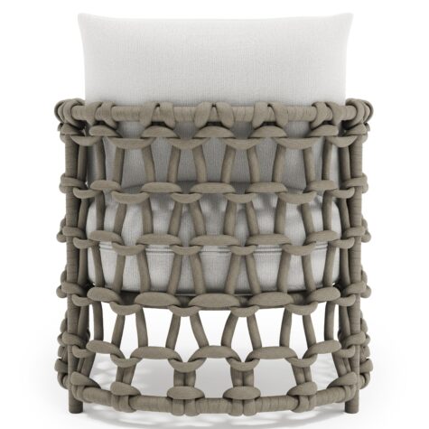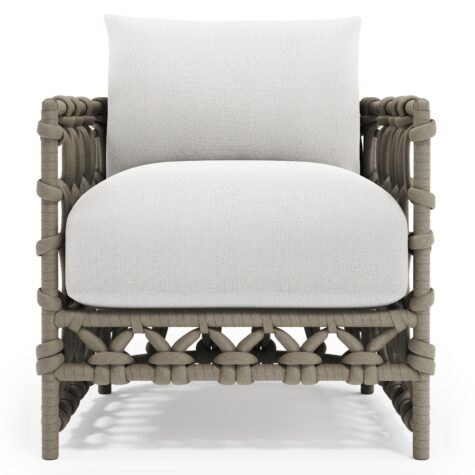 An open weave crafted of rope in a Shiitake finish twists a sophisticated pattern around a club chair frame. Comfort is key in this outdoor design with a deep seat cushion and a loose back pillow. The result is a chair that is sophisticated enough for indoor settings, but created with materials to withstand outdoor elements.