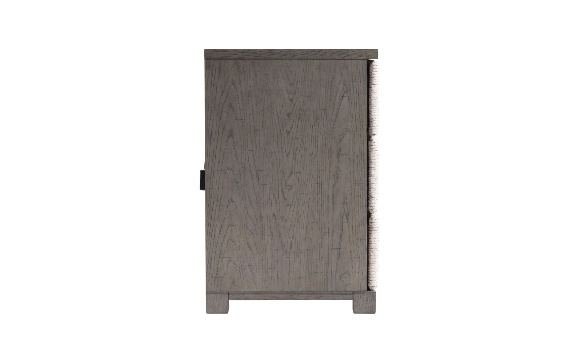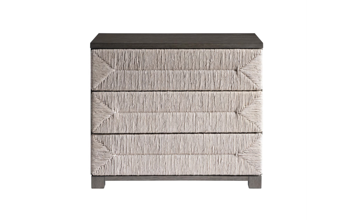 - Three push-to-open drawers wrapped in woven abaca in Light Grey Wash finish.