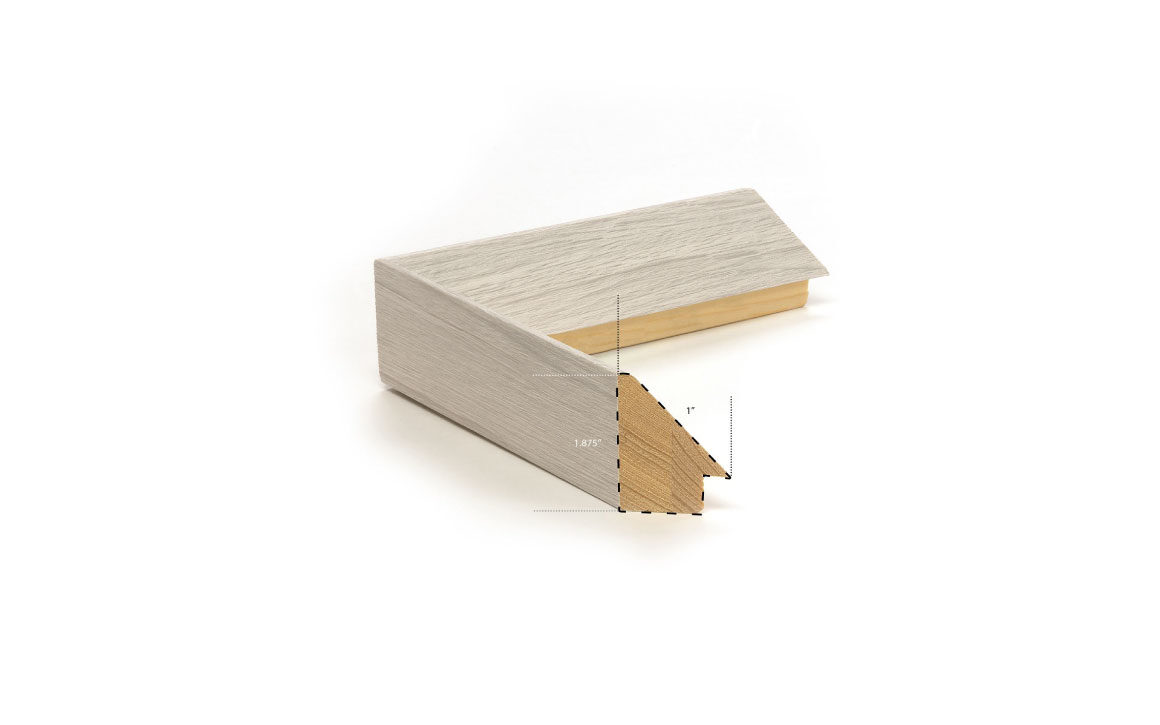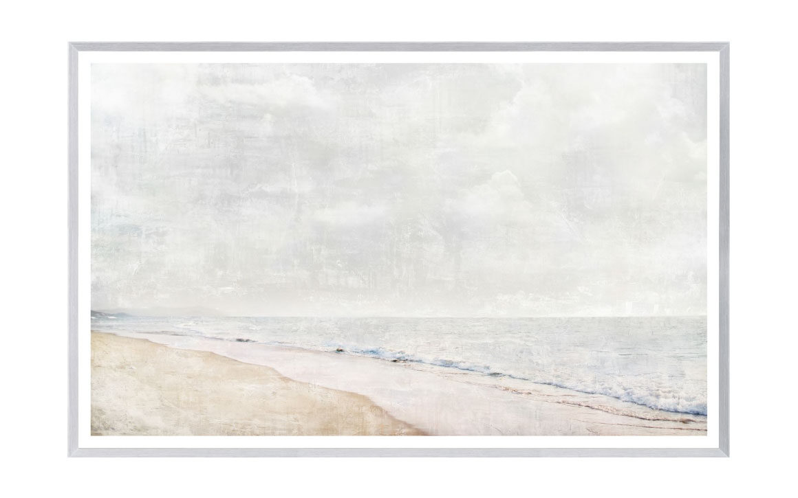 This beautiful beach landscape wall art showcases a serene photo of the motion of the tide on a sandy beach, combined with an intriguing combination of textures. In an angled white woodgrain frame.