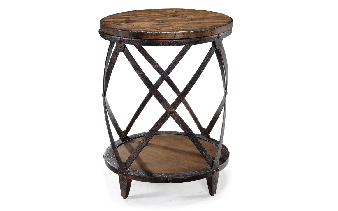 The Pinebrook Accent Table features contemporary accents like rustic iron legs, metal casters and rivet-edged metal supports reinforce the subtle character of the distressed natural pine.