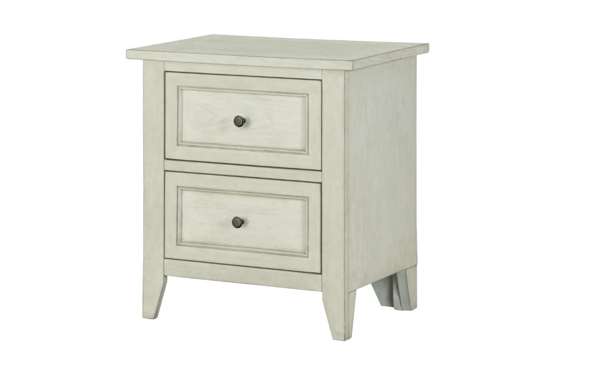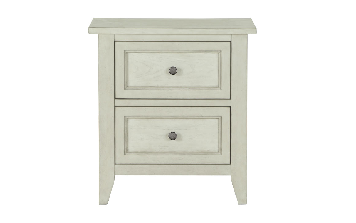 The Raelynn Drawer Nightstand has a fresh Weathered White finish on cathedral ash veneers and hardwoods that contrasts simple Weathered Bronze pulls to create timeless comfort in the Raelynn Collection. Climb into the clean and crisp feel of gorgeous Irish linen in the perfectly tailored panel bed which showcases the beveled panel and bead moulding detail that classifies this collection as updated Shaker. Traditional and transitional at once, Raelynn is the ideal cottage collection that is equally as at home in the suburbs.