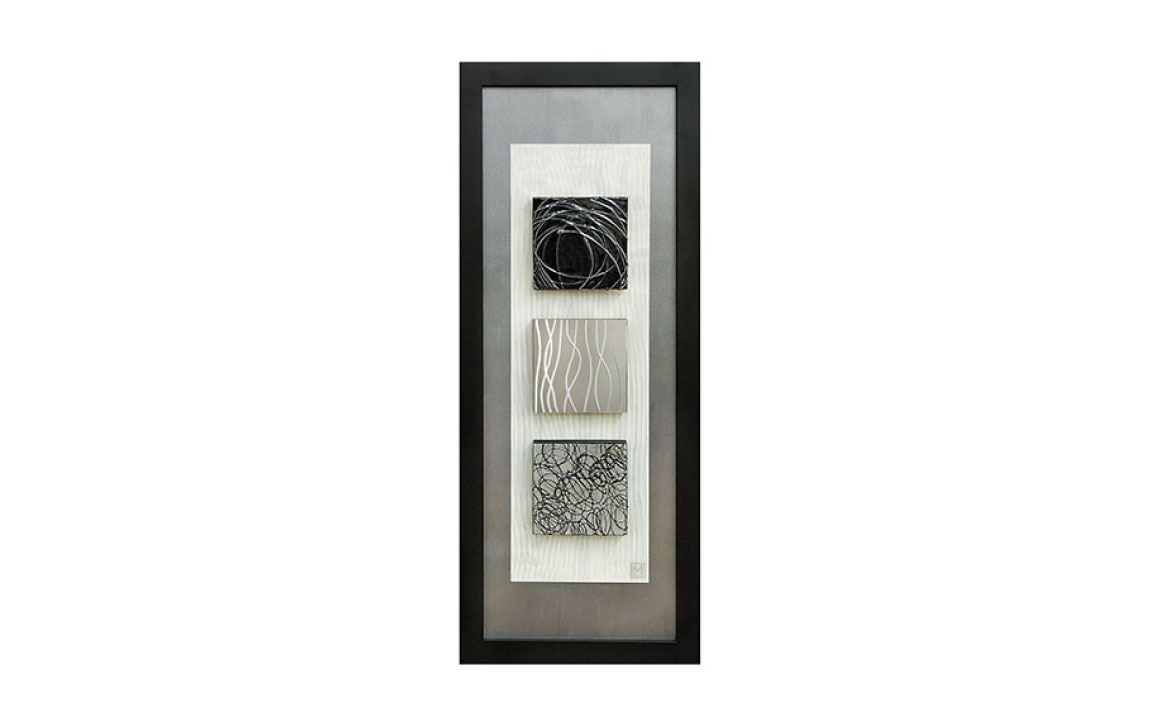 Reflections I is hand-painted with mirrors and textured wood blacks surrounded with a black frame.