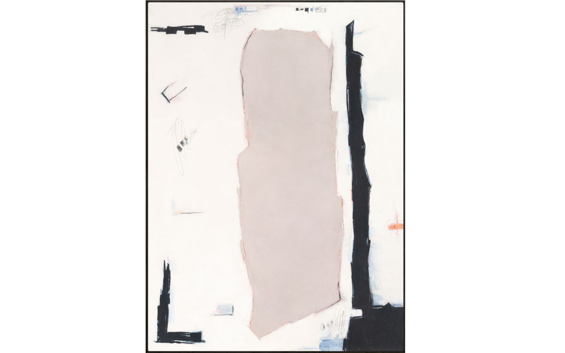 Remnants I, a framed piece of abstract wall art, showcases subtle layers of soft pastel colour surrounding energetic lines and strong black shapes in these mid-century-style abstracts. In a dark wood floater frame.