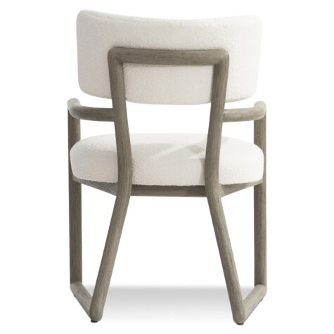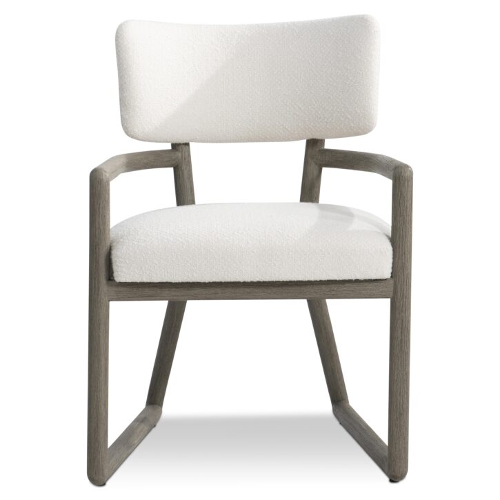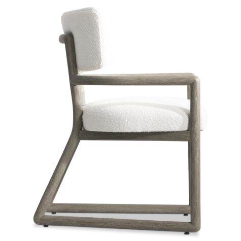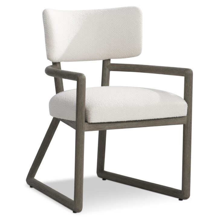Bold shaping creates a mesmerizing geometric style for the Rhodes outdoor arm chair. Crafted from carbonized teak in Weathered Teak finish, the frame supports a softly curved back and seat made of weather-resistant materials.