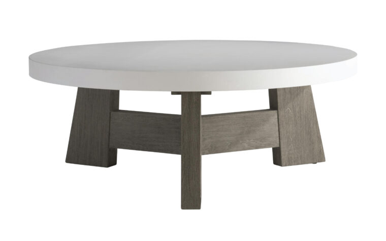 Bold geometric shapes come together to create a sophisticated earthiness in the Rochelle outdoor cocktail table. Angled legs in teak are joined by thick-cut center stretchers. The top is striking with its 42-inch circle of glass-reinforced concrete. Thick cut legs in a geometric pattern give this outdoor cocktail table a sophisticated earthiness.
