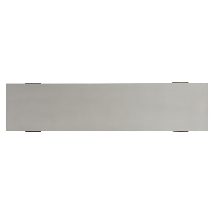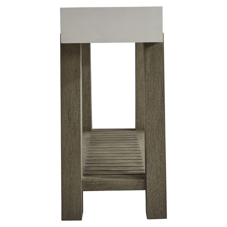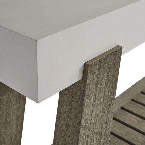 Mixed finishes are perfectly balanced in this modern organic outdoor console table. A Quarry smooth textured finish on the glass-reinforced concrete top perfectly complements the teak legs for the Rochelle outdoor console table. Angled legs move to the outside of the top, as they also support a lower slatted shelf for more storage options.