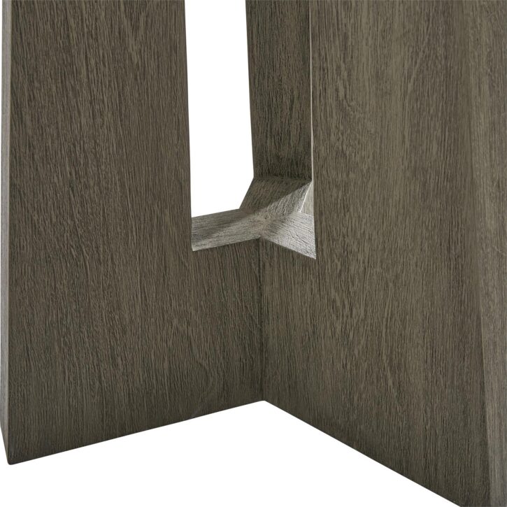 Three open-work triangles intersect to support the top of the Rochelle outdoor side table. The spaces between the teak legs create a sense of lightness that balances the glass-reinforced concrete top.
