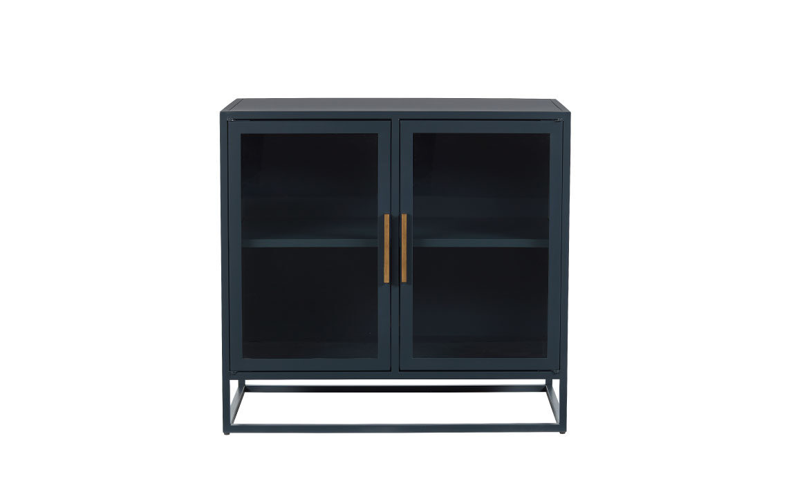 The striking Santorini Metal Kitchen Cabinet elevates interiors with calming seaside vibes, showcasing an alluring deep blue finish, clear glass doors, and sleek gold bar hardware.