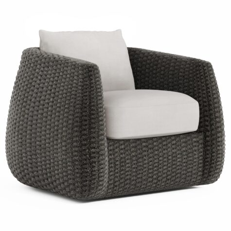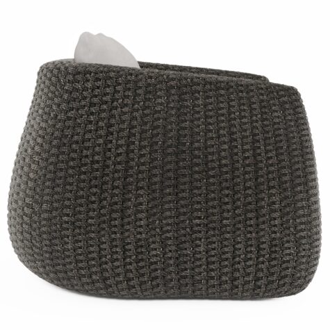 A generously rounded profile is woven around deep seat cushions for a comfortable outdoor chair. A generously rounded profile makes a distinctive style statement in the Sarene outdoor chair. The arms arc gently away from the seat on an all-weather woven frame. A deep back and seat cushion provide supreme comfort for outdoor living.