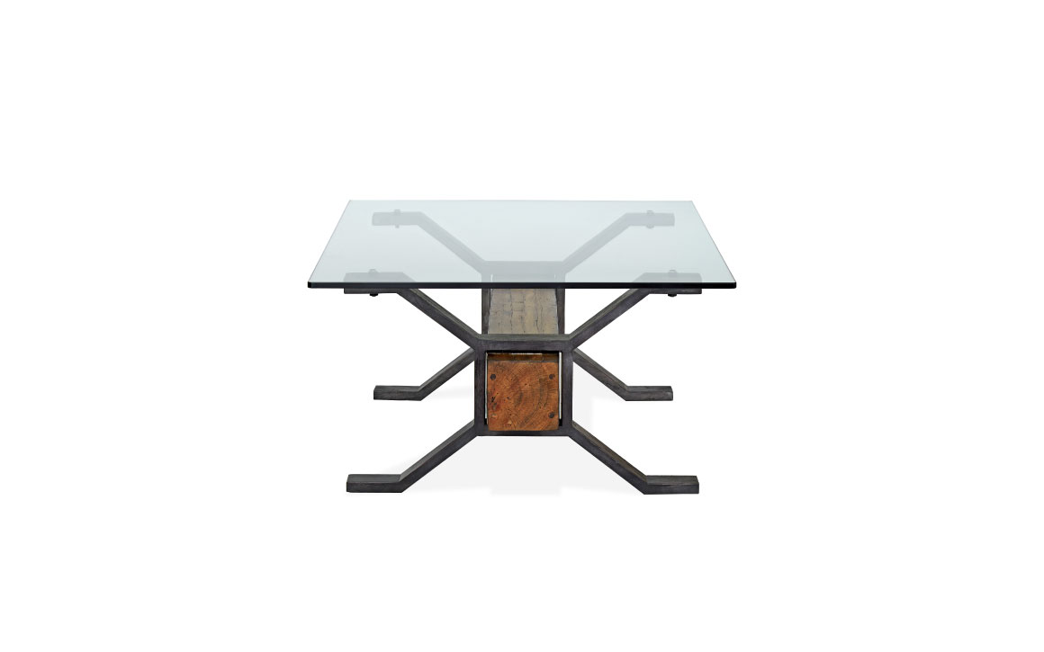 As if designed in a master blacksmith or woodcrafter’s workshop, Sawyer blends reclaimed wood, glass and metal artfully. With a stylized sawhorse theme, Smoked Iron finished metal creates the ‘X’ shaped supports that are joined by thick square wood stretchers that are washed in a Warm Nutmeg finish. 12mm flat edge, tempered glass rests atop the metal supports for a clearly repurposed feeling collection of sofa, rectangular cocktail and end tables.