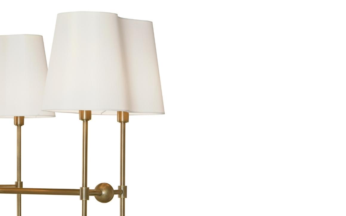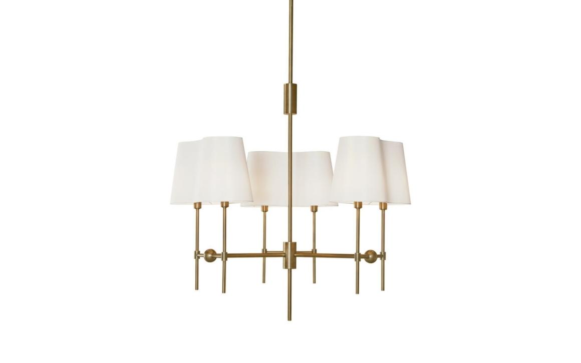 The Seymour Chandelier turns lighting into an optical experience with its trio of uniquely shaped “peanut” shades crafted from off-white cotton. Each shade conceals two sockets, creating layered illumination that feels both soft and dimensional. The antique brass frame adds warmth and sophistication, making this chandelier a conversation piece above dining tables or in open living spaces.