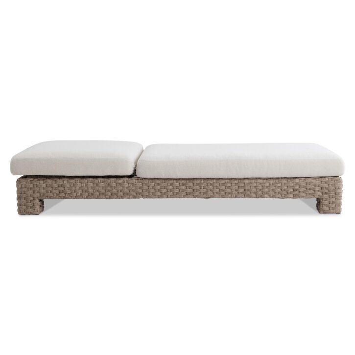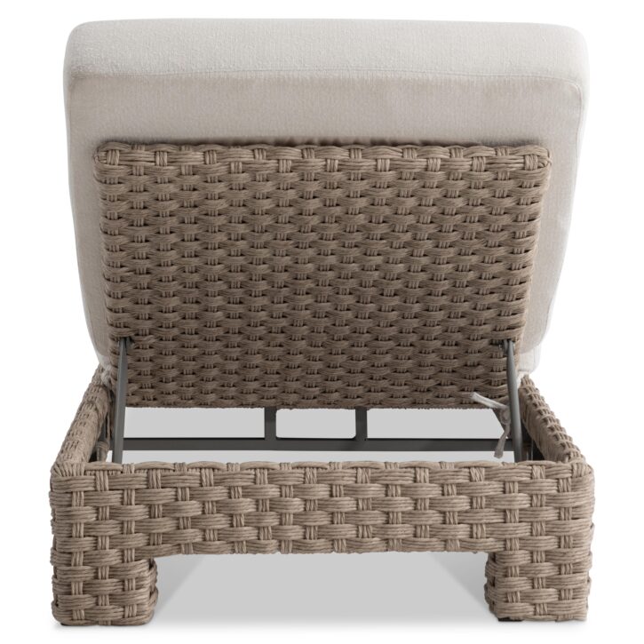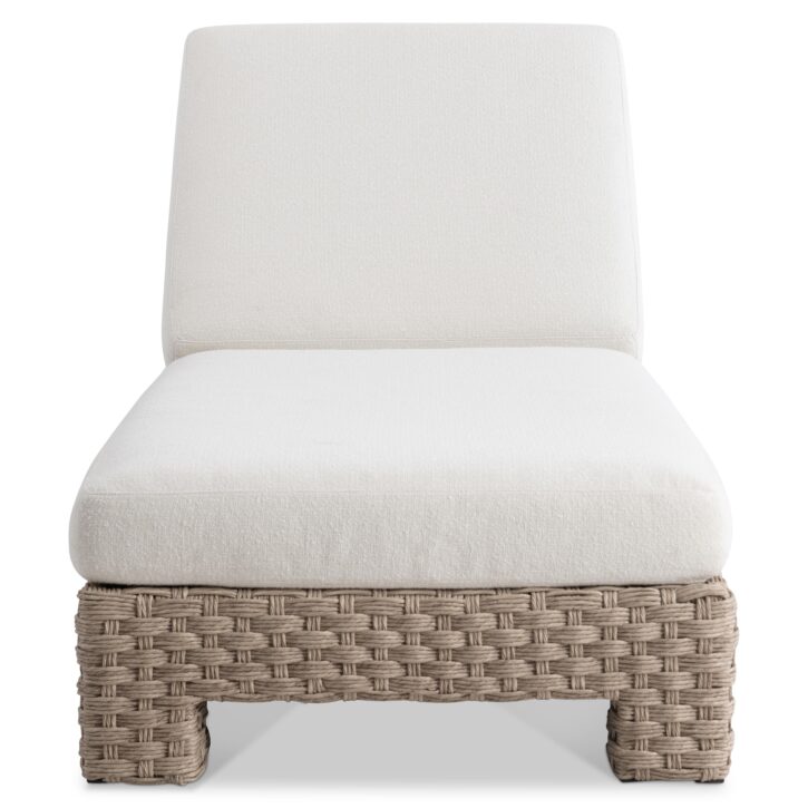 A generous profile crafts a bold style for this woven outdoor chaise. The Trieste outdoor chaise takes a bold approach with its generous lines and deep weave all-weather wicker pattern in Pampas finish. Deep comfort is on offer in the seat cushion and back pillows, and an open base crafts a geometric style thats elevated and modern.