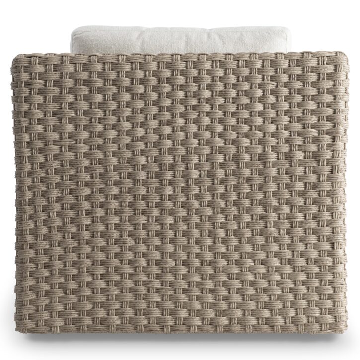 A generous profile crafts a bold style for this woven outdoor swivel chair. The Trieste outdoor swivel chair takes a bold approach with its generous lines and deep weave all-weather wicker pattern in Pampas finish. Deep comfort is on offer in the T-shaped seat cushion and back pillow, and a swivel base crafts a moveable style thats elevated and modern.