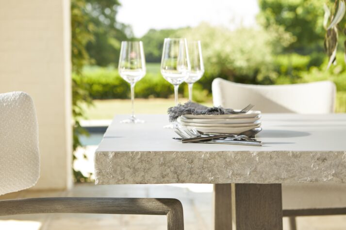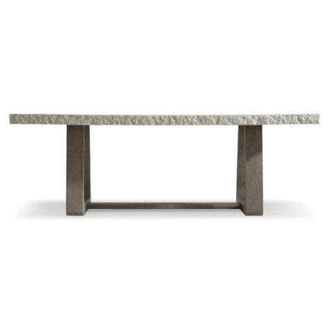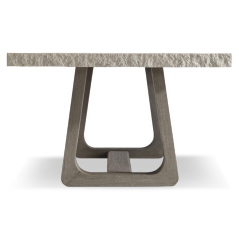 A modern organic design showcases the look of rough-hewn stone over a teak base on the Trouville dining table. The smooth top offers a chiseled edge and is finished in Sand Grey. The balance of natural materials is formed with two curving pedestals in loops of gorgeous teak connected by a stretcher base. The natural style, at home in an outdoor setting, is equally beautiful indoors.