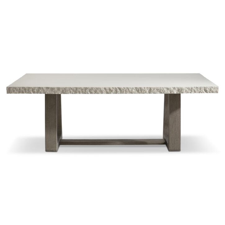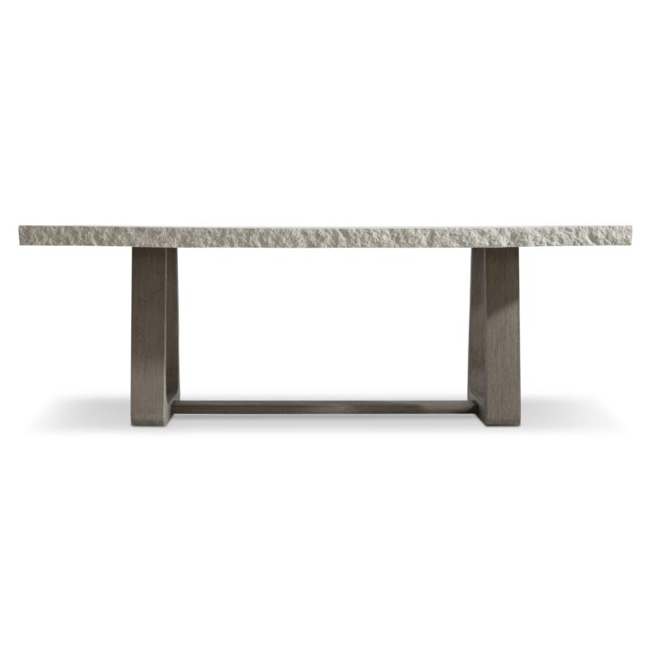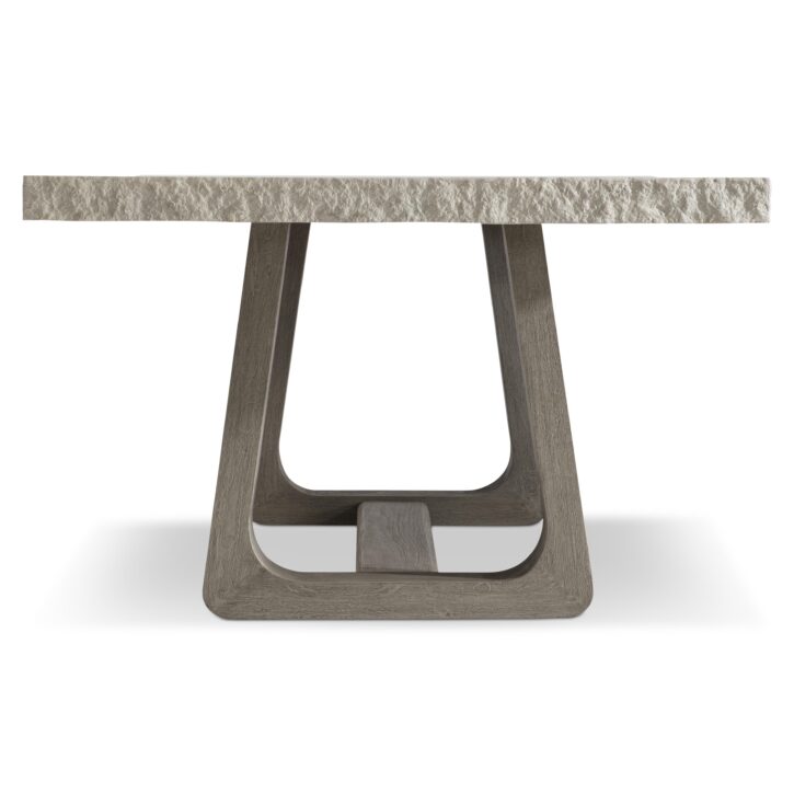 A modern organic design showcases the look of rough-hewn stone over a teak base on the Trouville dining table. The smooth top offers a chiseled edge and is finished in Sand Grey. The balance of natural materials is formed with two curving pedestals in loops of gorgeous teak connected by a stretcher base. The natural style, at home in an outdoor setting, is equally beautiful indoors.