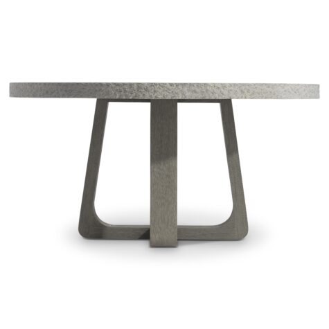 A modern organic design showcases the look of rough-hewn stone over the teak base of the Trouville dining table. The round, concrete top offers a chiseled edge and is finished in Sand Grey. The balance of natural materials is formed with intersecting curved pedestals in loops of teak. The natural style, at home in an outdoor setting, is equally beautiful indoors.