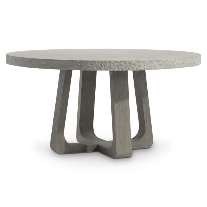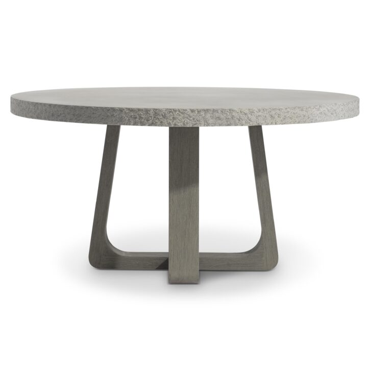 A modern organic design showcases the look of rough-hewn stone over the teak base of the Trouville dining table. The round, concrete top offers a chiseled edge and is finished in Sand Grey. The balance of natural materials is formed with intersecting curved pedestals in loops of teak. The natural style, at home in an outdoor setting, is equally beautiful indoors.